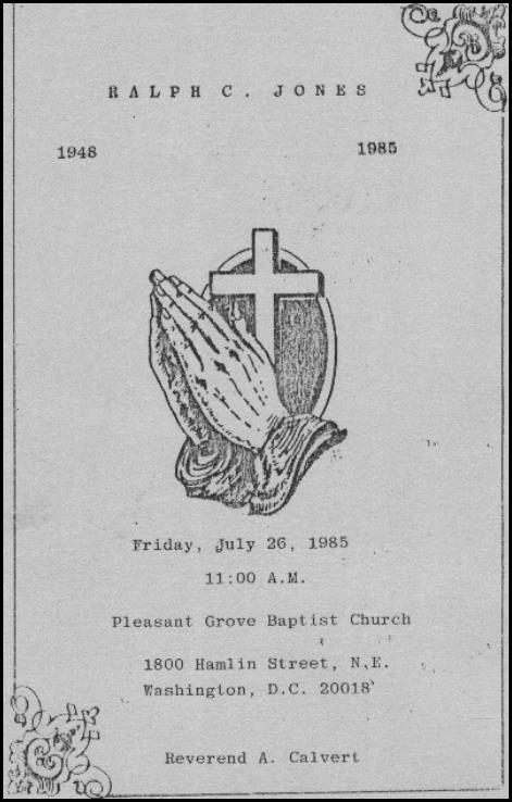 Ralph C. Jones, (Butch) was born on August 21, 1948, in Washington, D.C., to Pansy and Robert Jones. He entered into eternal rest on July 22, 1985. Ralph received his education in the public schools of the District of Columbia. He married Angela Chiles, Samuels (Brandi) on February 26,, 1983.